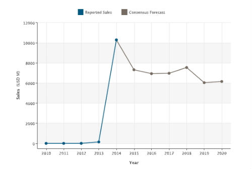 Sovaldi銷(xiāo)售情況及市場(chǎng)預(yù)測(cè)。(圖1)
