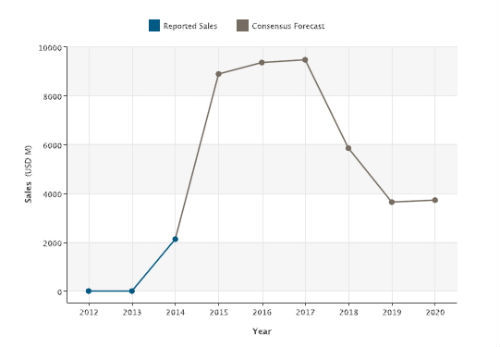Harvoni銷(xiāo)售情況及市場(chǎng)預(yù)測(cè)。(圖2)