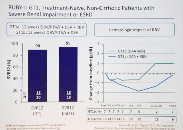 如Pockros PJ等報告的RUBY-1研究在GT-1型初治非肝硬化但合并嚴重腎損害或終末期腎病的患者中開展,GT1a型患者接受3D方案+RBV治療12周,GT1b型患者接受3D方案,不合并RBV治療12周。意向性治療分析結(jié)果顯示SVR12為90%,而對治療后數(shù)據(jù)完整的患者進行調(diào)整后的意向性治療分析結(jié)果顯示SVR12為95%。不良事件為輕度或中度,且沒有患者因不良事件需停用試驗藥物?;颊叩母文I功能指標亦未出現(xiàn)有臨床意義的顯著變化。此外,EBR/GZR方案在美國獲得了批準,C-SURFER研究的結(jié)果顯示出滿意的療效,不過出現(xiàn)了嚴重不良事件報告和因不良事件而停藥的報告。