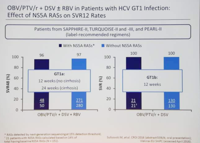 有學者對SAPPHIRE-II、TURQUOSIE-II和TURQUOSIE-III以及PEARL-II研究的數(shù)據(jù)進行匯總后發(fā)現(xiàn),GT1a型患者用3D方案聯(lián)合RBV治療12周(無肝硬化)或24周(合并肝硬化),不管是否攜帶NS5A RAS,都可獲得很高的SVR48:96%(RAS+)和97%(RAS-),GT1b型患者療效更為顯著,3D方案治療12周,無論是否攜帶RAS,所有患者均獲得SVR(100%)。