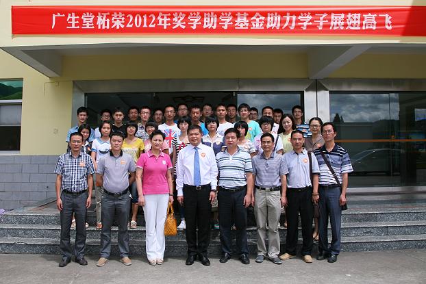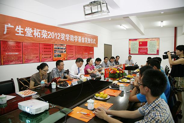 2012年8月22日,“廣生堂柘榮獎(jiǎng)學(xué)助學(xué)基金”在福建廣生堂藥業(yè)股份有限公司柘榮生產(chǎn)基地順利召開。本次獎(jiǎng)助學(xué)活動(dòng)資助的對(duì)象是柘榮一中2012屆考上大學(xué)的8名優(yōu)秀學(xué)生以及19名家庭貧困的品學(xué)兼優(yōu)的學(xué)生?;顒?dòng)受到寧德市教育局、柘榮縣政府、縣教育局及柘榮一中相關(guān)領(lǐng)導(dǎo)的大力支持與協(xié)助。柘榮縣委常委教工委書記吳秀蘭、柘榮縣教育局局長許永安、柘榮一中校長陳坤其及廣生堂藥業(yè)董事長等列席座談會(huì),會(huì)上和學(xué)子親切交流,鼓勵(lì)學(xué)子好好學(xué)習(xí),努力成材,建設(shè)祖國家園。