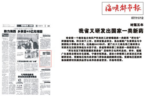 我省第一個擁有獨(dú)立知識產(chǎn)權(quán)的抗乙肝病毒國家一類新藥“阿甘定”阿德福韋酯,昨日終于上市。這項(xiàng)省重點(diǎn)項(xiàng)目,是由福建廣生堂藥業(yè)與中國藥科大學(xué)聯(lián)合開發(fā)。這是繼2001年9月,廈門北大之路生物工程有限公司研發(fā)出注射用神經(jīng)生長因子后,我省取得的第二張國家一類新藥證書。