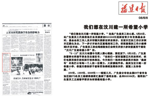 “5?12”汶川大地震令無數(shù)人撕心裂肺,潸然淚下。5月15日,廣生堂的董事長李國平親自發(fā)出倡議書:“在我們一面欺負震區(qū)災民的同時,我們也要用我們的實際行動來表達,今天我們一起來吹響戰(zhàn)勝災難的‘集結號’盡我們公司每一個人的一份薄力,大家攜起手來,集資為汶川建一所希望小學,希望無辜的孩子能夠更快得到溫暖的關懷,重塑人生的希望。”
