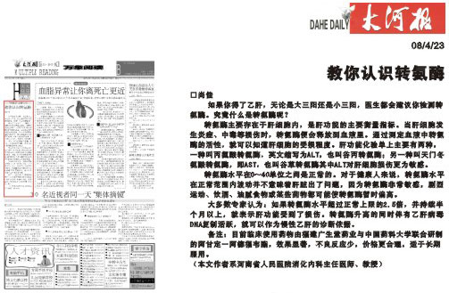 轉氨酶主要存在于肝細胞內,是肝功能的主要衡量指標。當肝細胞發(fā)生炎癥、中毒等損傷時,轉氨酶便會釋放到血液里。通過測定血液中轉氨酶的活性,就可以知道肝細胞的受損程度。肝功能化驗單上主要有兩種,一種叫丙氨酸轉氨酶,英文縮寫為ALT,也叫谷丙轉氨酶;另一種叫天門冬氨酸轉氨酶,即AST,也叫谷草轉氨酶其中ALT對肝細胞損傷更為敏感。