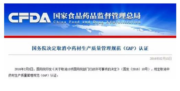 2016年2月3日,國務(wù)院印發(fā)《關(guān)于取消13項國務(wù)院部門行政許可事項的決定》(國發(fā)〔2016〕10號),規(guī)定取消中藥材生產(chǎn)質(zhì)量管理規(guī)范(GAP)認證。
