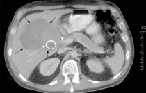 肝動脈瘤 肝動脈瘤是一種少見的血管性病變,分為肝外或肝內(nèi)型;其大小可自針尖至柚子樣不等。肝內(nèi)型多破入膽管引起膽道出血,肝外型破裂引起血腹。肝動脈瘤在沒有破裂時,由于無明顯臨床癥狀而不易被發(fā)現(xiàn),因此多數(shù)是破裂后才得到診斷。